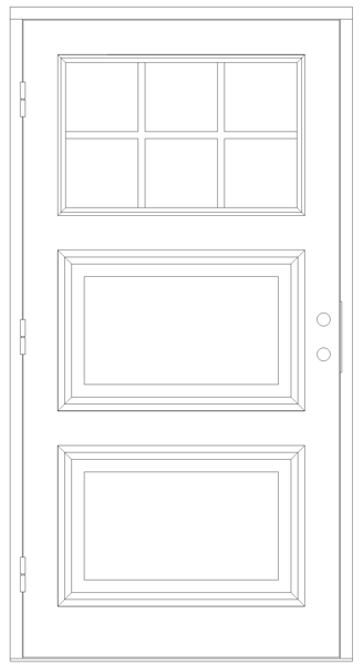 Enkeldörr i 3 lika delar där översta fått glas och spröjs