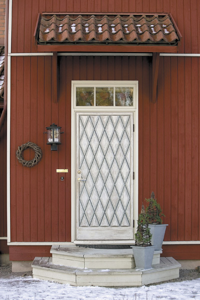 Övrigt: Dörren har romber som målats med kulör i tre olika nyanser. En mörkare ton i botten och ljusare i mitten samt ljusast på den yttersta delen. Överljus sitter monterat ovanför dörren.