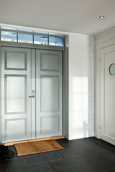 Övrigt: Här visas dörren från insidan och man kan se hur fin dörren blir med tillvalet insida med dekorlist. Kunden har valt bort romberna som annars sitter i övre och nedre spegeln.